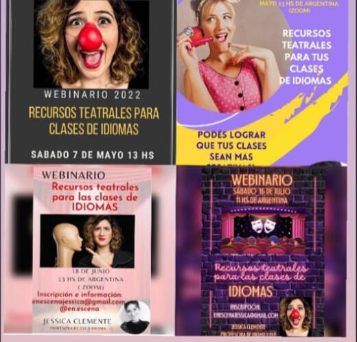 Una vez al mes, realizo webinarios al que acceden profesores de idiomas de diversos países en los que trabajamos durante 2 hs, en diferentes actividades teatrales para abordar distintos contenidos gramaticales. Son 100% prácticos y al finalizar se entrega una certificación.